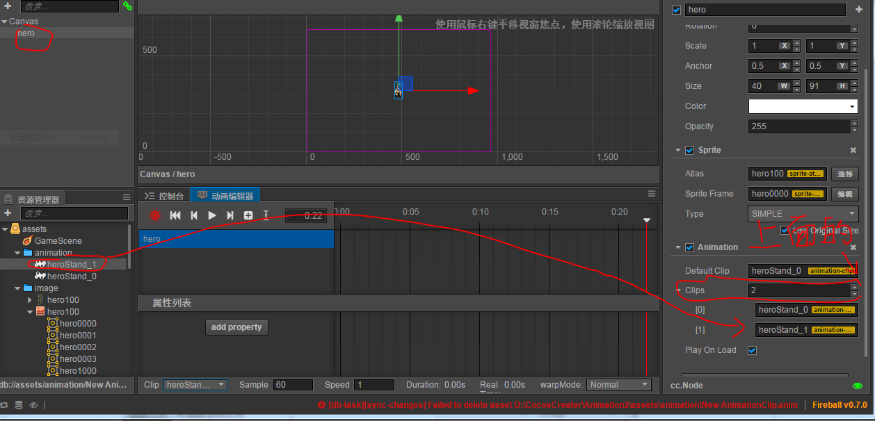 然后呢 选中 层级管理器中的hero 将属性管理器中Animation 组件的 clip 加一 (记住是上面的三角形箭头 没事按下面的箭头的话 后果自负吧) 然后将资源管理器中的heroStand_1拖到属性管理器中的Clips 中