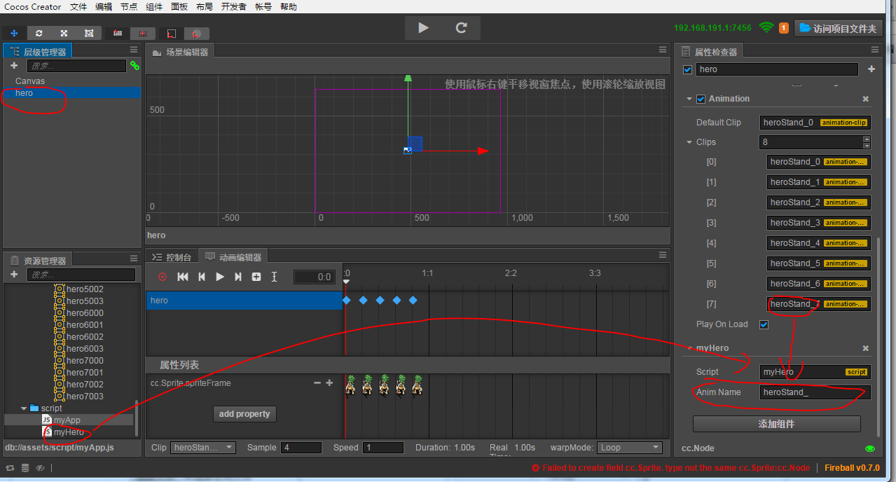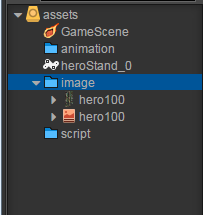 然后选中 层级管理器的hero 等待加载完成 将资源管理中的myHero.js拖到属性选择器的Script中 并在AnimName 中 填入 heroStand_ 也就是动画统一的前缀
