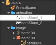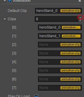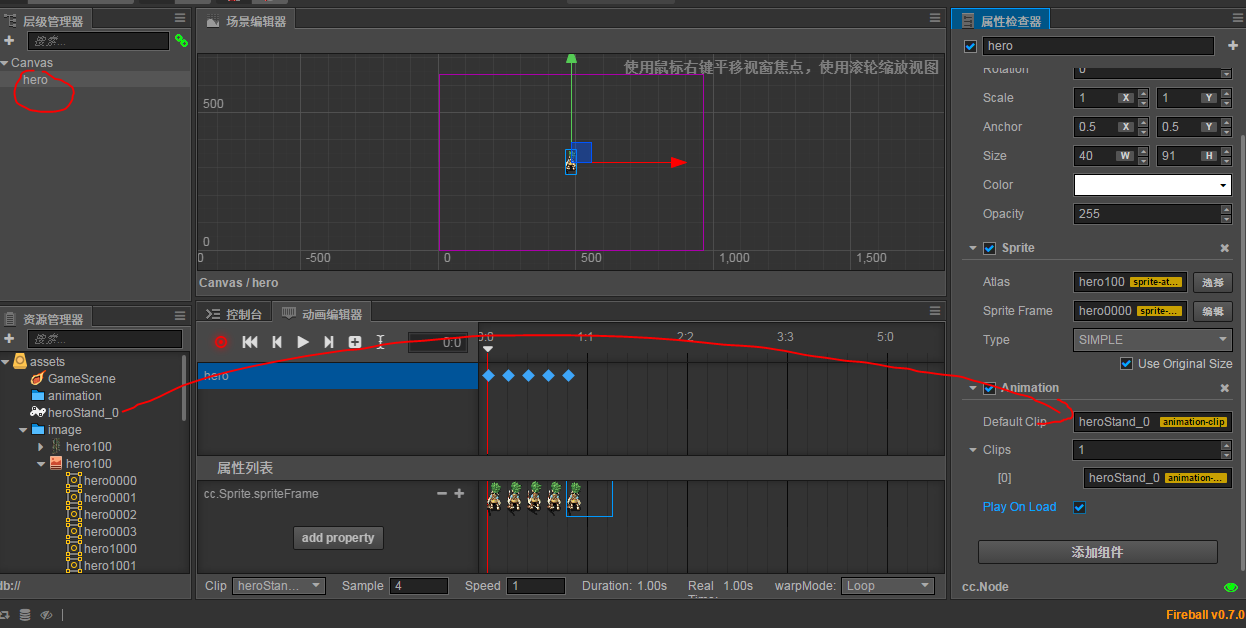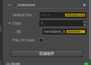 然后呢 选中层级管理器中的 hero 将资源管理器的 heroStand_0 拖动到 属性管理器的Default Clip 中 选中 下面的 Play On Load