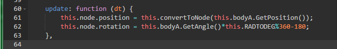 然后呢,在update取得b2world计算到的最新位置和最新弧度,我们再把它转回CCC的坐标和角度,给到node 就完事啦