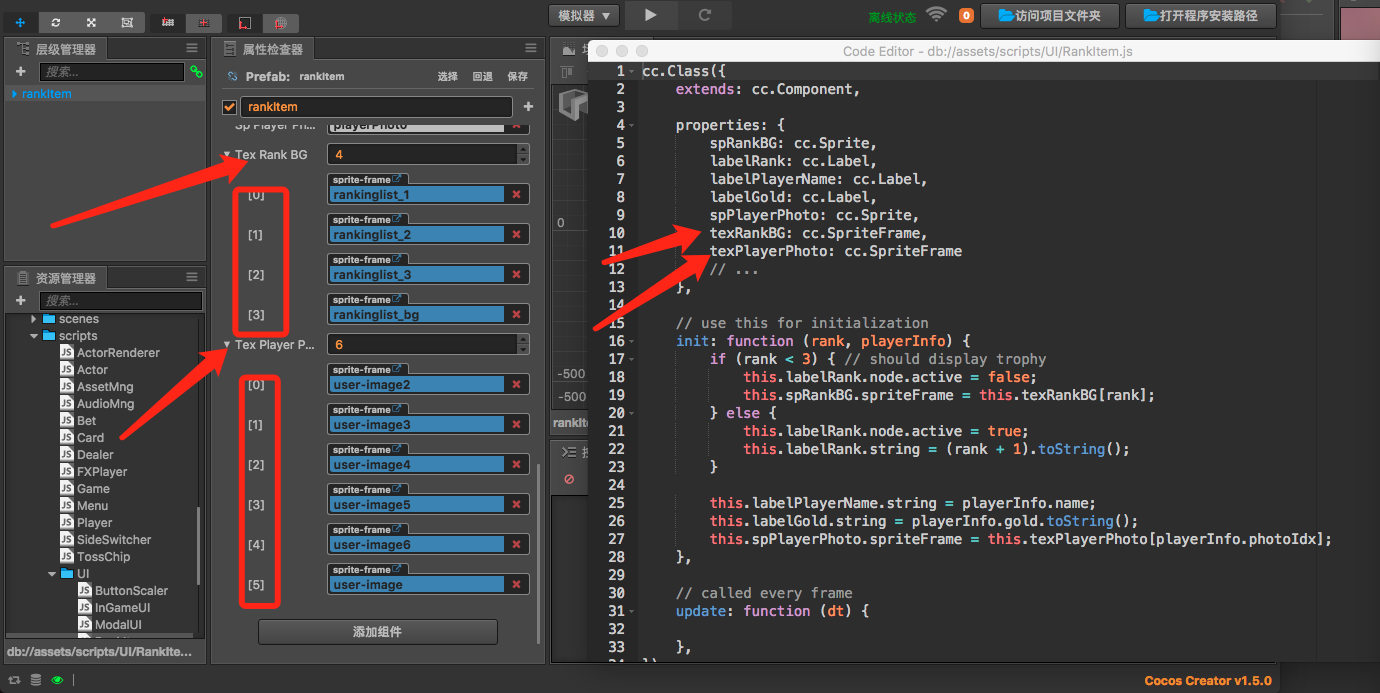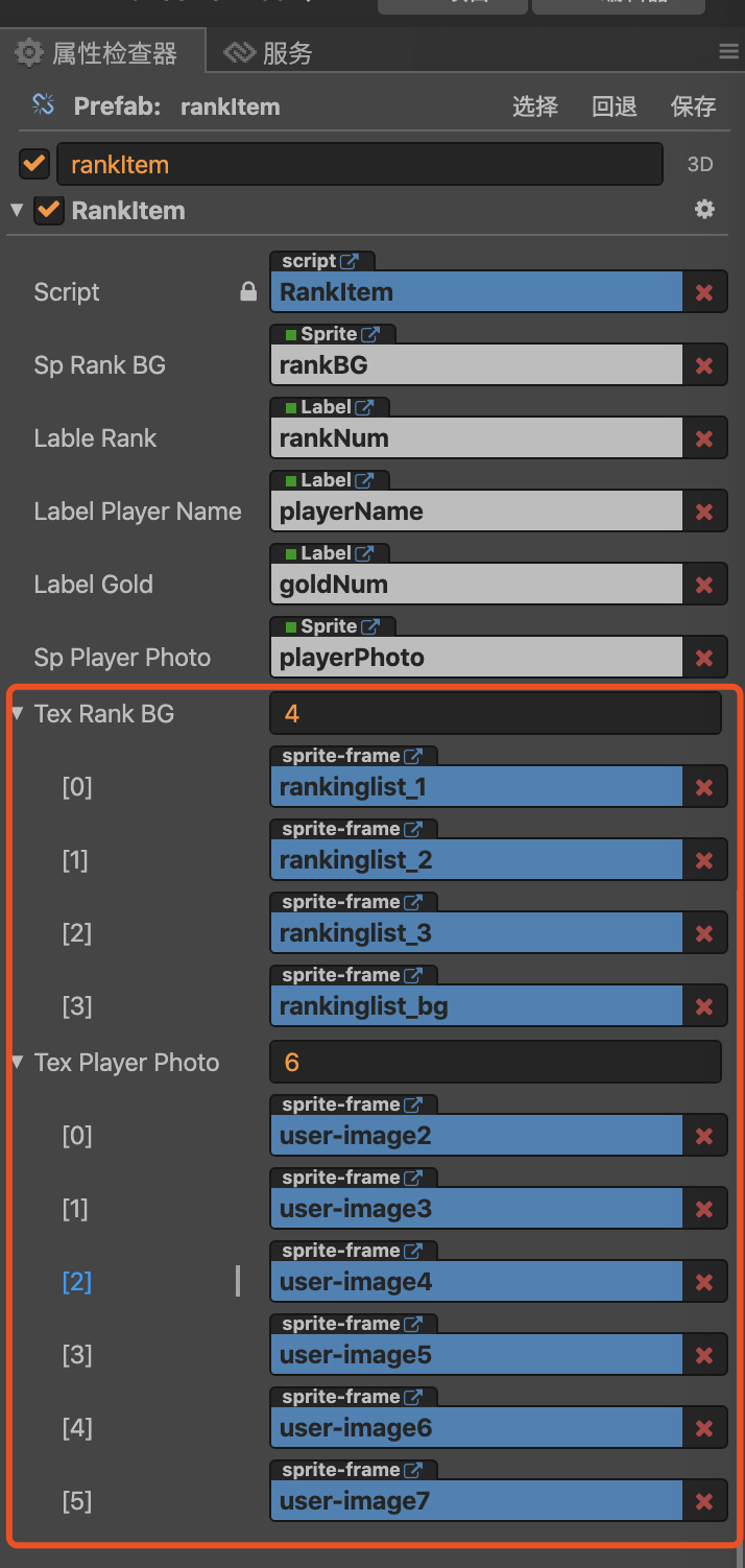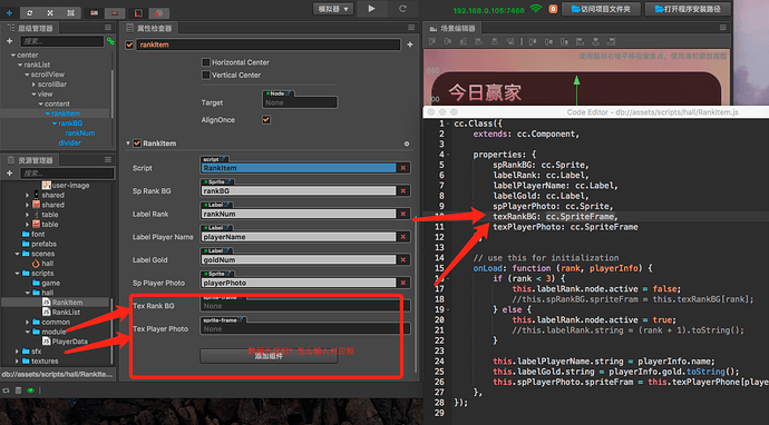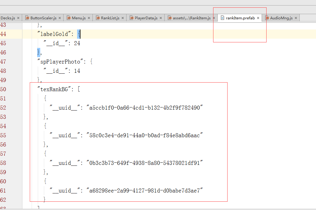 直接修改rankItem.prefab这个文件,把texRankBG这条属性手动赋值就行了,不要什么都靠IDE,我们是程序员,是要写程序的!它就是一个JSON文件,里面的__uuid__的值可以在IED的资源面板中获取到