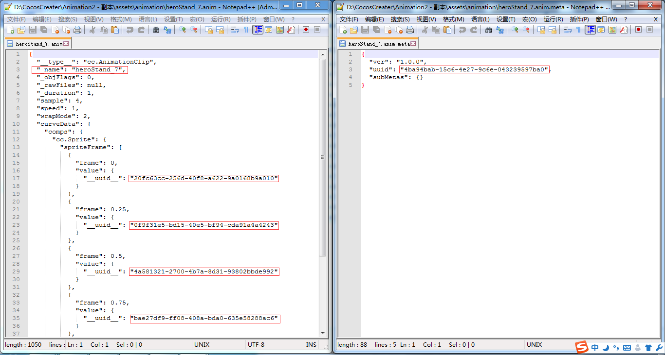 然后我们将heroStand_7.anim和heroStand_7.anim.meta打开看一下吧 (记事本或者NotePad++都可以 不过记事本没有排版)