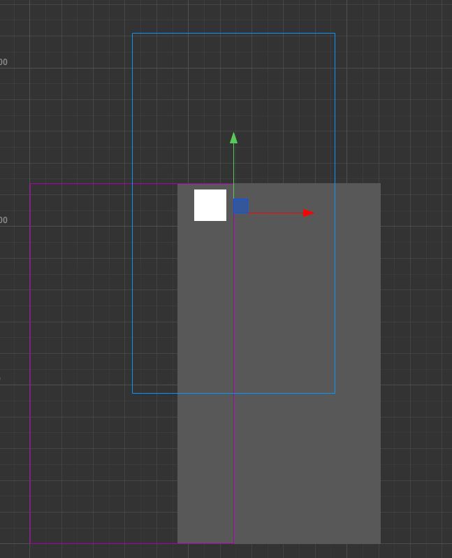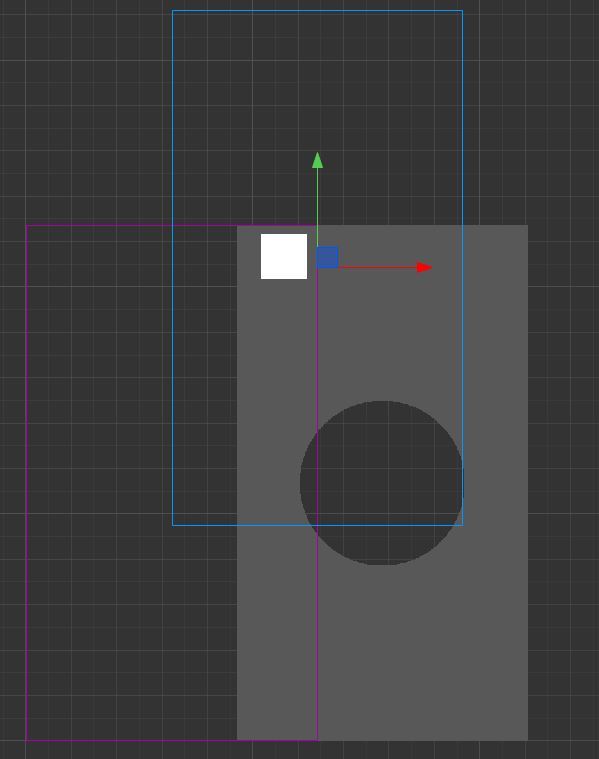 以下紫色方框为canvas,蓝色方框为摄像机,灰色方块为绑定了mask组件的节点(此时mask组件尚未打开),白色方块为参考点