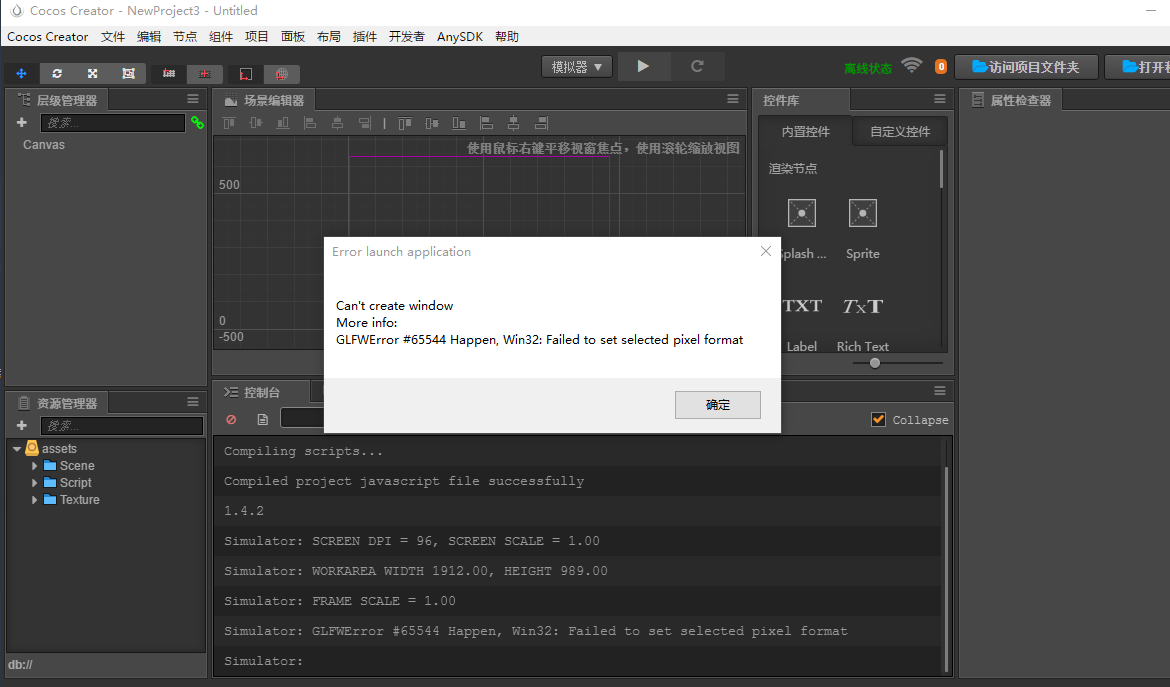 CocosCreator 报错:Simulator: GLFWError #65544 Happen, Win32: Failed to set selected pixel format