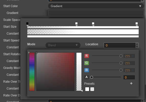 如下图所示,我想使用 gradient 来调节 startcolor 属性,但是发现 alpha key 只能设置 0 和 255 两个值,这个是设计如此吗? 我看引擎源码是取值然后lerp,理论上这个值可以设置 0~255 之间的任意值的吧,能有办法编辑这个值吗