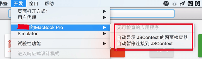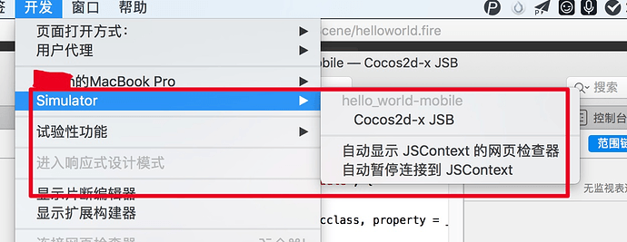 Safari 菜单中选择 开发 -> 你的 Mac 设备 -> Cocos2d-x JSB。