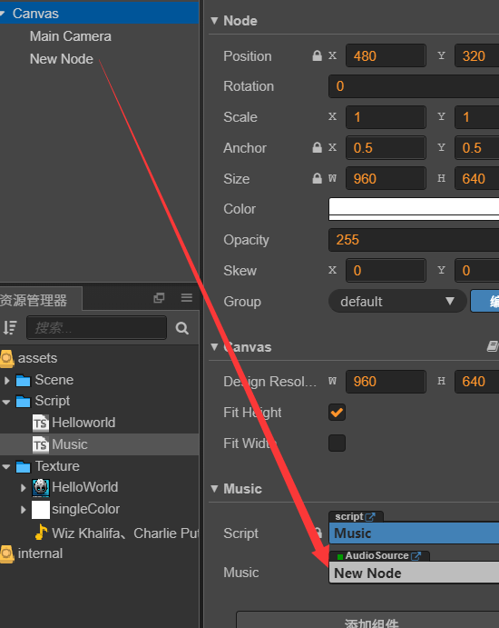 需要绑定的节点就是刚刚添加AudioSource组件的节点