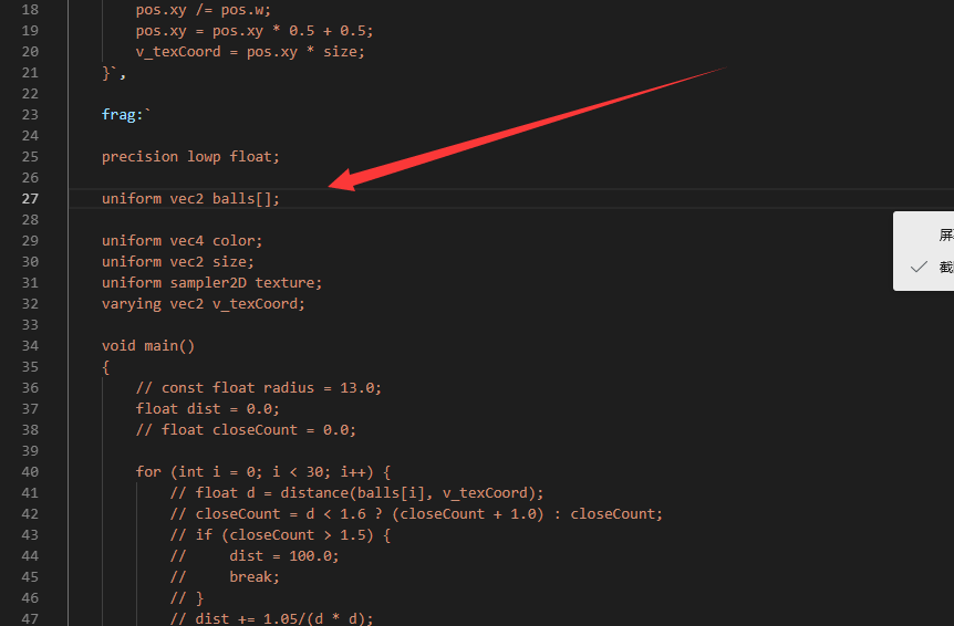 shader里面数组不能这样定义的,你要分配多少个要给定具体数,比如uniform vec2 balls[10];,然后你应该需要调用十次传入vec2数据的方法,而不是直接传整个数组进去,印象中应该是这样的
