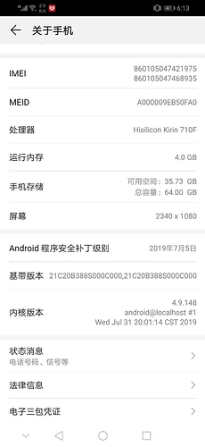 1.机型:华为:JKM-AL00a,android系统版本号:9,详情如下: