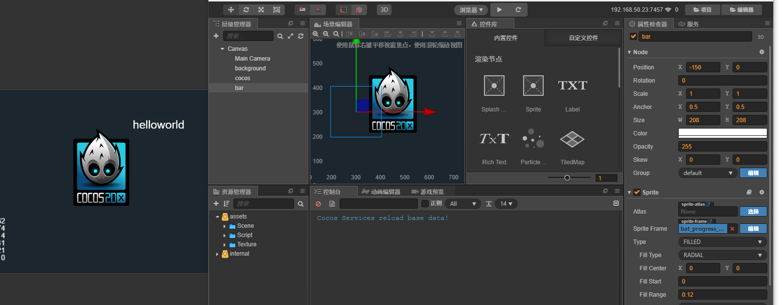 此工程中若把bar节点的FillRange改为0,则脚本动态创建出来的helloworld文字不会显示。