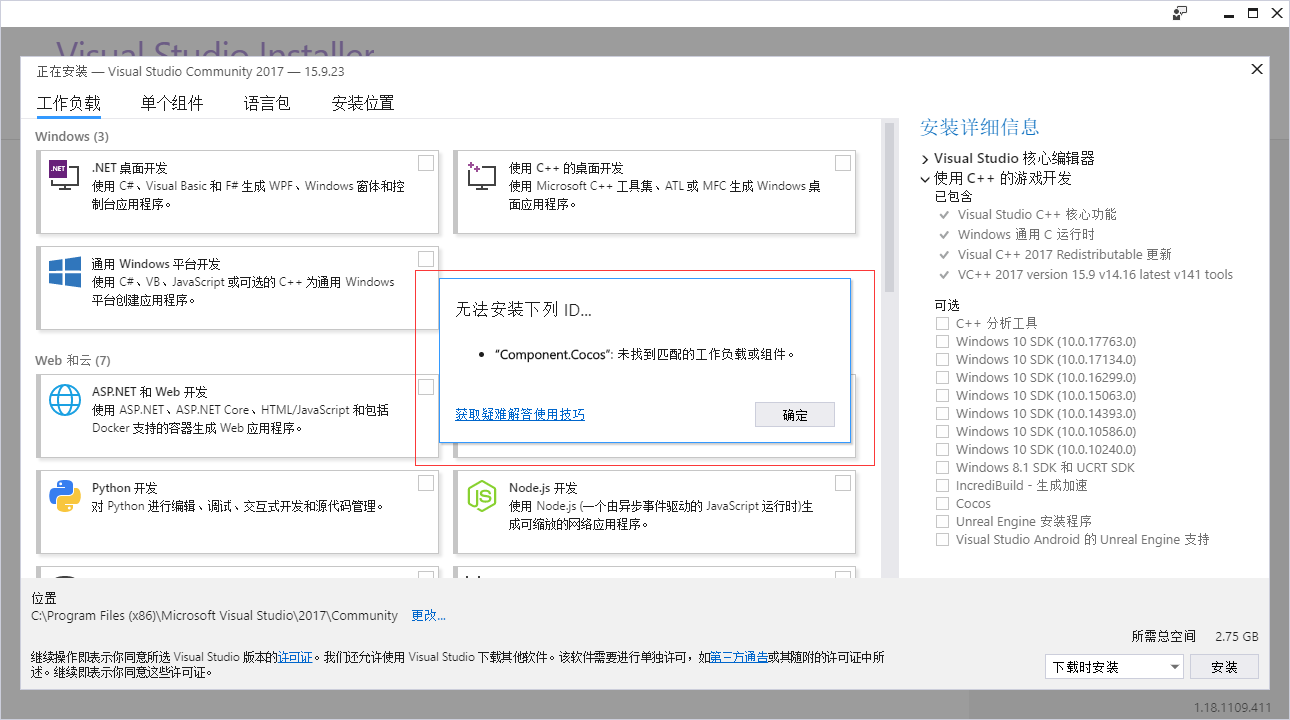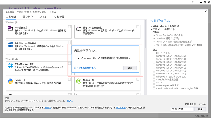 安装creator的时候出现component.cocos未找到匹配的工作负载和组件,有大佬遇到过吗?