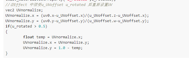我做溶解shader实验结果不对。 经研究是合图处理这计算有问题。 l: x, r:z, b: w, t: y; 我的改成了UVnormalize.y = (uv0.y-u_UVoffset.y)/(u_UVoffset.y-u_UVoffset.w);