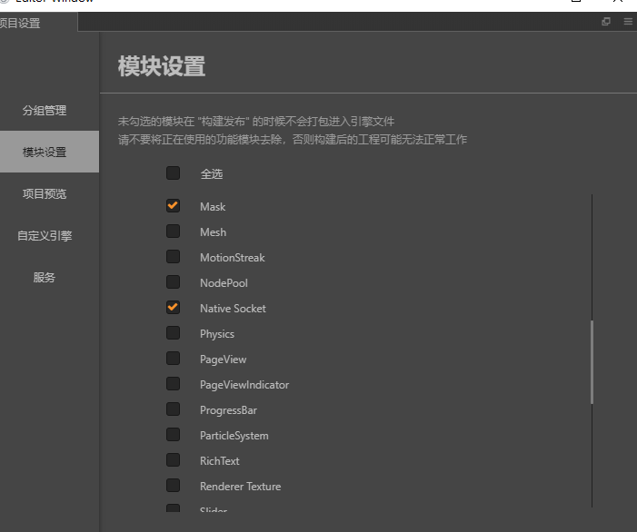 每次发布都要搞这个模块设置,多了怕包大, 少了又要一个个找哪个没勾上,为什么不能弄成自动的,按理引擎应该知道用了哪些组件吧