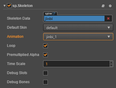 2.然后重新加载Creator界面,再次打开这个节点,Spine组件下方Animation显示为空,无法选择,但是游戏画面上这个节点的动画显示正常