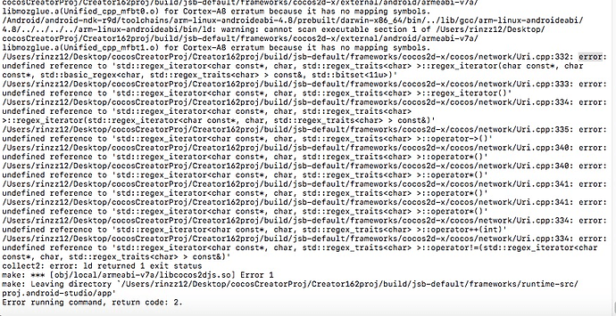 /Users/rinzz12/Desktop/cocosCreatorProj/Creator162proj/build/jsb-default/frameworks/cocos2d-x/cocos/network/Uri.cpp:333: error: undefined reference to ‘std::regex_iterator<char const*, char, std::regex_traits >::regex_iterator()’