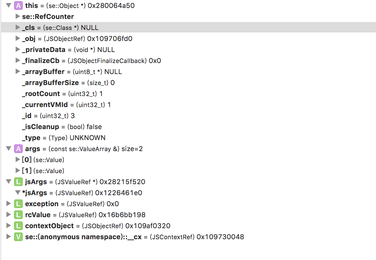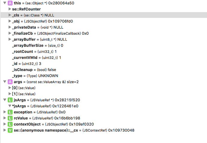 真机调试,发现闪退位置发生在JSValueRef rcValue = JSObjectCallAsFunction(__cx, _obj, contextObject, args.size(), jsArgs, &exception);这段代码里。求帮忙,@panda,@jare