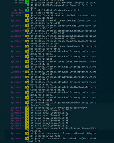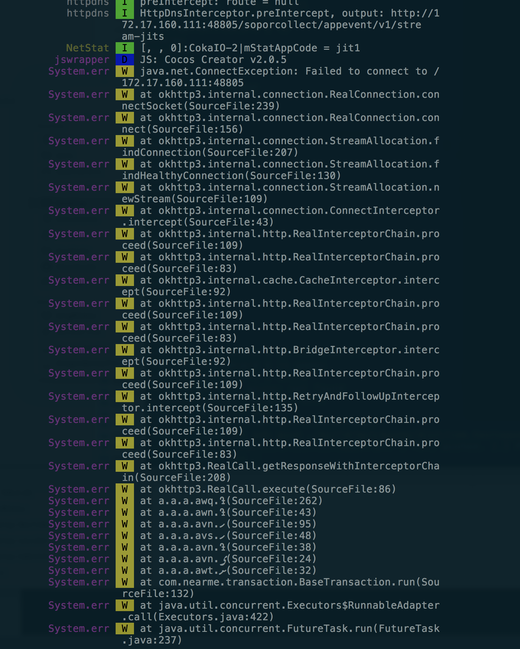 日志中,可以看到打印了2.0.5creator引擎,然后就是socket中断,没有任何其他有用信息