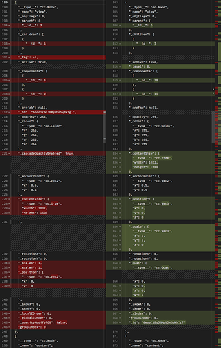 在上图中,左侧是旧版本的 fire 文件,右侧是用 2.0.x 打开后自动修改后的文件,在右侧 350 行所示,新增 _scale 的 z 为 0,导致节点无法显示。