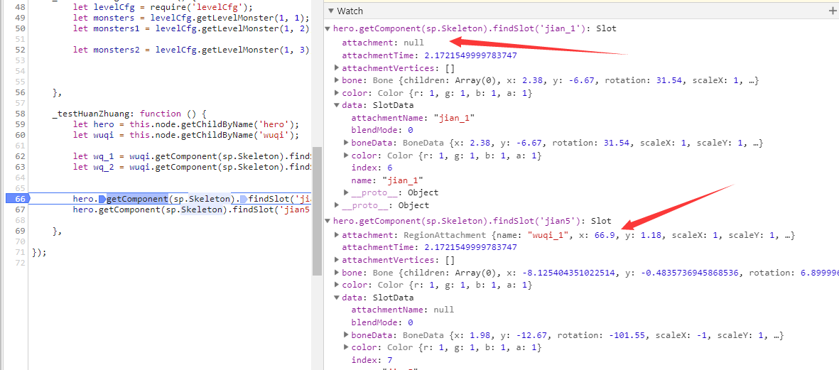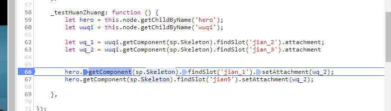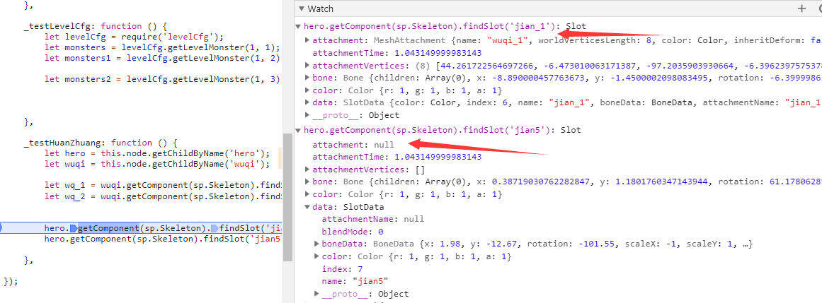 在动画播放一段时间后,调用testHuanZhuang函数,断点插槽数据,