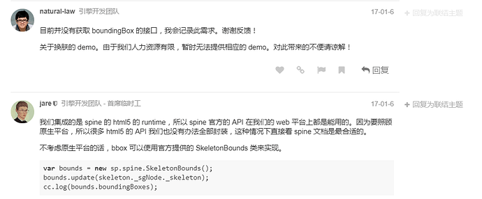 在spine动画编辑器添加边界框后,在ccc如何获取?文档中没有看到API, sp.Skeleton组件信息都打印出来看了,也没看到边界框数据。。。