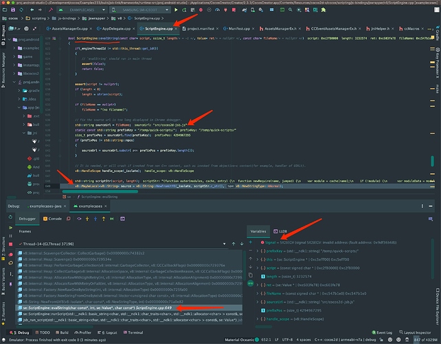 android studio 上调试显示为 加载 “src/cocos2d-jsb.js” 代码时崩溃.