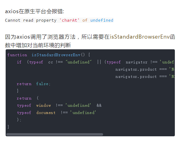 我不知道微信小程序的navigator.product的值是啥,如果navigator.product有值的话那就强制写死isStandardBrowserEnv的返回值, 如果navigator.product没有值就用这个判断