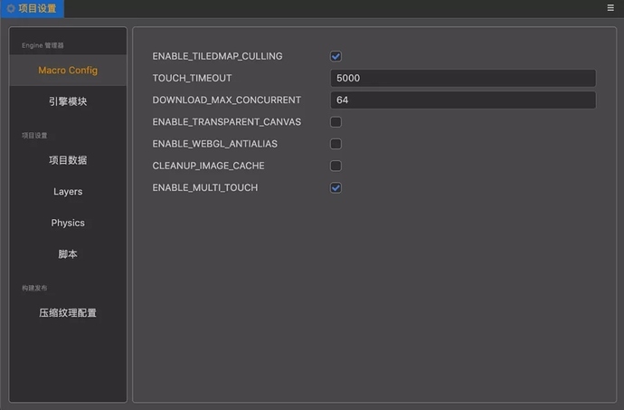 很多开发者可能用过引擎中的内置宏配置:cc.macro,之前的使用仍然有诸多不便,比如有一部分需要在引擎启动前设置才能够生效;引擎的启动流程修改也偶尔会改变设置时机和行为。为了解决设置宏配置的麻烦,我们在编辑器的项目配置中直接支持了可视化配置,参考项目设置文档的引擎宏配置章节。