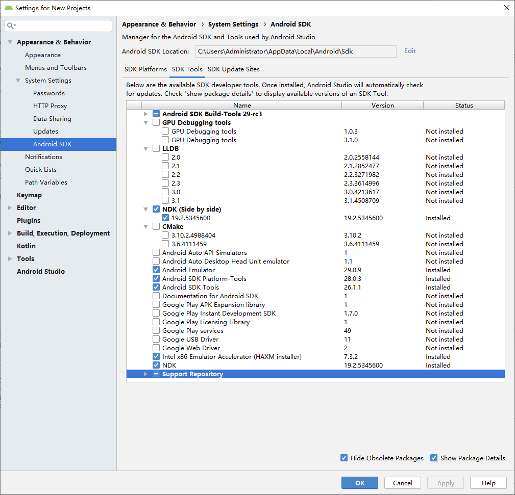 Parsing C:\Users\Administrator\AppData\Local\Android\Sdk\ndk\19.2.5345600\package.xml