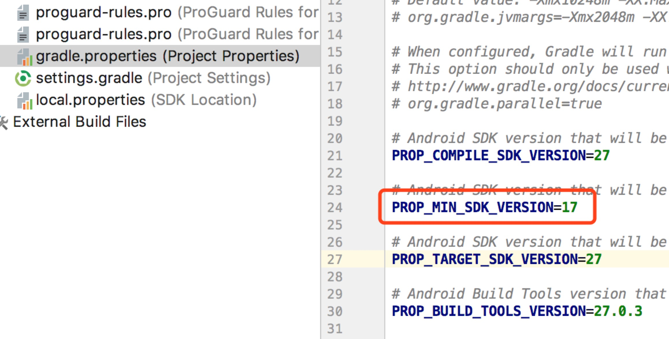 gradle.properties文件已修改成如下参数,编译打包的时候的参数已修改成API LEVEL 26,其他配置没变