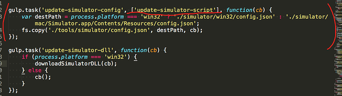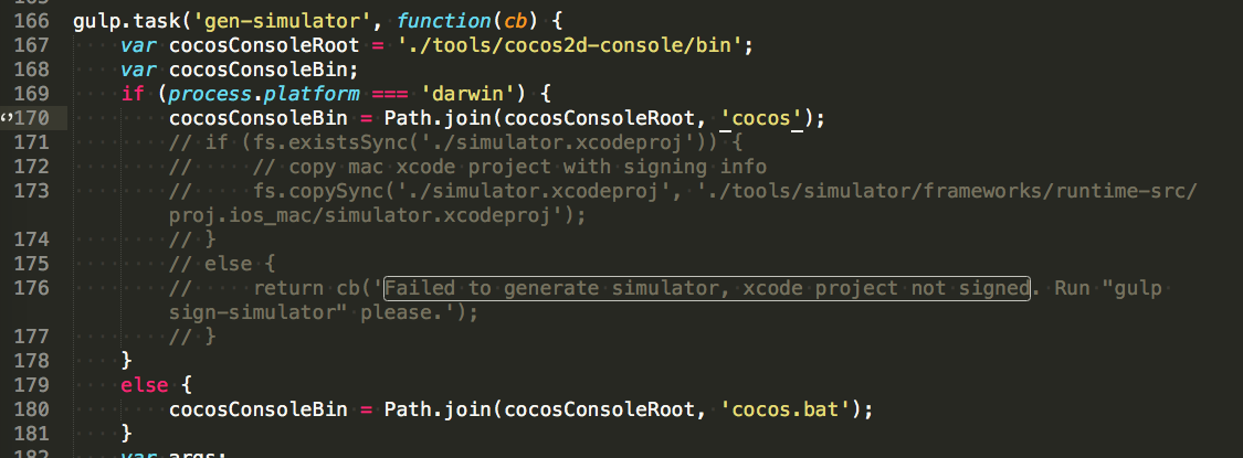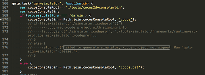 在 gulp sign-simulator 运行之后,按照官方指导,如果不打算在xcode中执行,直接关了就好,但是我关了xcode发现脚本并没有随之停止。好吧,手动停下,我以为这样就算完成了。然而再运行gen-simulator他说Failed to generate simulator, xcode project not signed。我试了好几次都不行,于是再看源码,在 gulpfile.js 中找到报错的地方,删除
