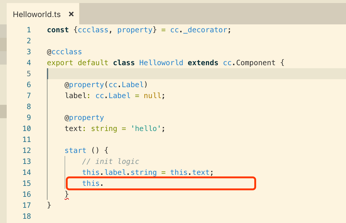 新建一个TypeScript的Helloworld项目, 然后在start函数里面加多一句"this."如下图