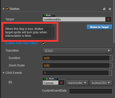 场景中有一个Button,Transition设置 SCALE,Enable Auto Gray Effect勾选,为什么设置禁用 button.getComponent(cc.Button).interactable = false; 变灰的效果没出来,是我操作方式不对吗?