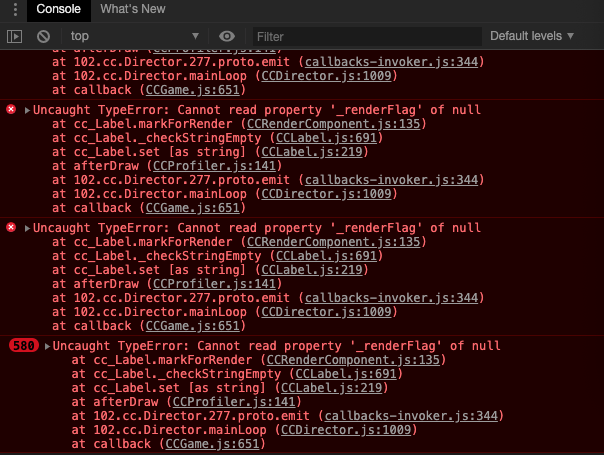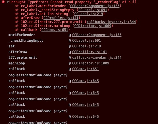 先做一个弹窗功能实现游戏“再来一次”功能,弹窗能正常显示,回调cc.game.restart后,重新加载游戏场景,出现Cannot read property ‘_renderFlag’ of null错误。