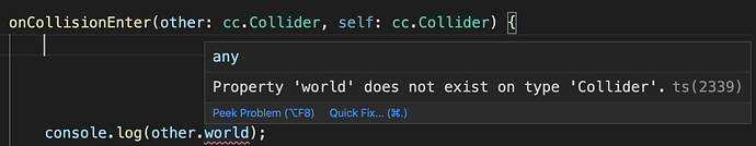 collider 本来就没 world 这个属性吧?你可以转换成你想要的具体某类 collider 再获取相应属性