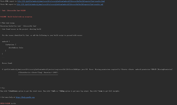 G:\gitfile\android_demo\cocos2d-x\cocos\platform\android\java\src\org\cocos2dx\lib\Cocos2dxHelper.java:355: Error: Missing permissions required by Vibrator.vibrate: android.permission.VIBRATE [MissingPermission]