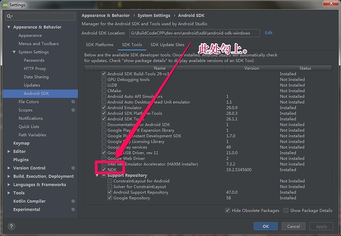 为了和官方人员保持一致,请用Android Studio内置的管理器下载 SDK 和 NDK,不要从官网或其他渠道下载安装。