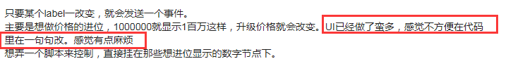 主要是想做价格的进位,1000000就显示1百万这样,升级价格就会改变。UI已经做了蛮多,感觉不方便在代码里在一句句改。感觉有点麻烦