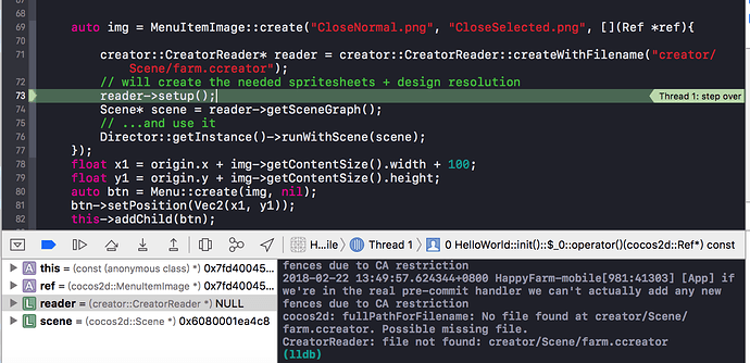 在cocos-2dx工程iOS平台下,运行在模拟器上面,当我切换场景到creator导入的场景时崩溃,报错信息是“ No file found at creator/Scene/farm.ccreator. Possible missing file.”,提示我文件不存在,reader初始化失败为NULL,如下图: