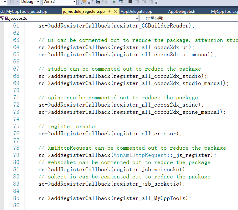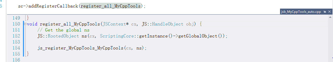 要看一下 MyCppTools 的类注册函数, js_register_MyCppTools