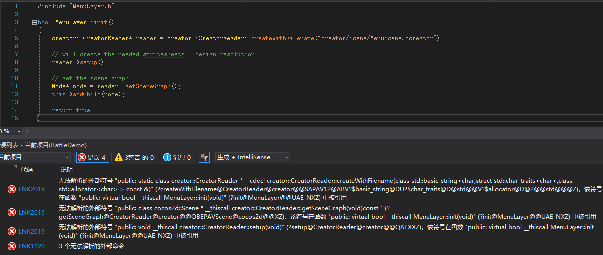 我按资料的上的思路,用creator代替studio,用插件导出场景和动画给2d-x用,按照文档搞,VS2017在附加包含目录加入了reader路径,用了文档提供的reader的代码,运行报错