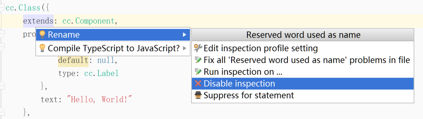 另外WebStorm会对extends, default报保留关键字错误(不影响编译),可以对它们加上引号,或者停止WebStorm对该问题的检查(选中extends后按Alt+Enter出现菜单):