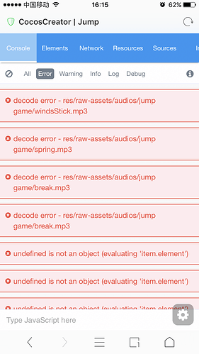 求问大神: 在电脑网页和模拟器上面没有问题,但是到iphone的浏览器上面,老是报这些问题,然后就没有声音了,是什么原因呢?
