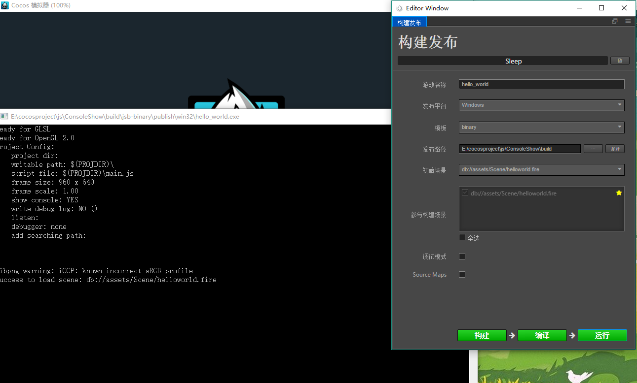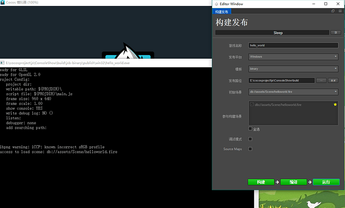 构建->编译->运行 依然会显示控制台,运行\build\jsb-binary\publish\win32目录下的可执行程序也是如此。当然在模板选择default的时候没有上述问题。
