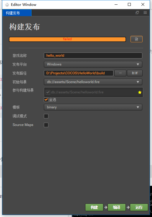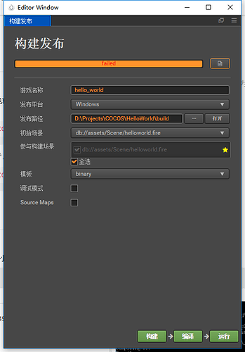 正在执行:’“C:\Program Files (x86)\Microsoft Visual Studio 14.0\Common7\IDE\devenv.com” “D:\Projects\COCOS\HelloWorld\build\jsb-binary\frameworks\runtime-src\proj.win32\hello_world.sln” /Build “Release” /Project “hello_world”’