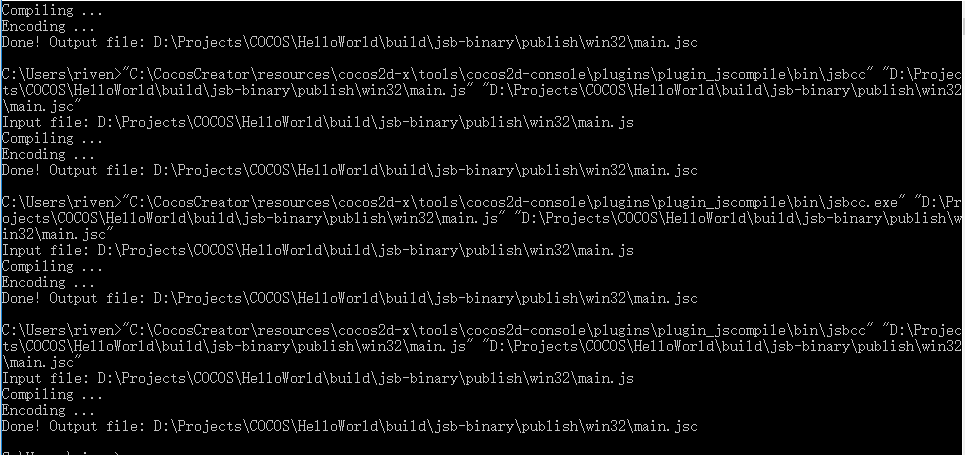 正在执行:’“C:\CocosCreator\resources\cocos2d-x\tools\cocos2d-console\plugins\plugin_jscompile\bin\jsbcc” “D:\Projects\COCOS\HelloWorld\build\jsb-binary\publish\win32\main.js” “D:\Projects\COCOS\HelloWorld\build\jsb-binary\publish\win32\main.jsc”’