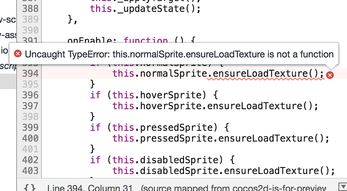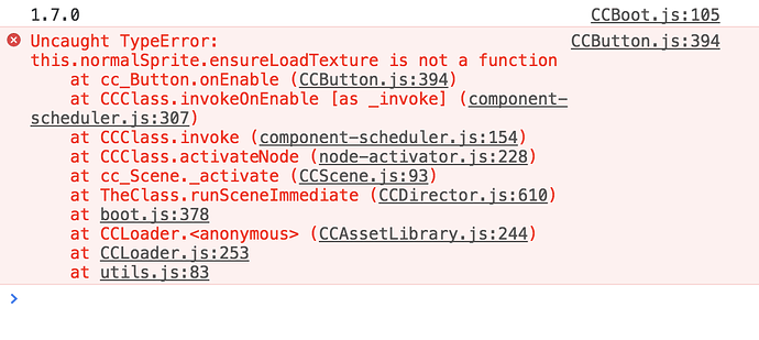 ensureLoadTexture 是 CCSpriteFrame 的函数,你按钮有重新赋值 normalSprite?