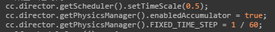 试试修改physicManager的FIXED_TIME_STEP属性,如果默认是1/60,那1/30应该是二倍速