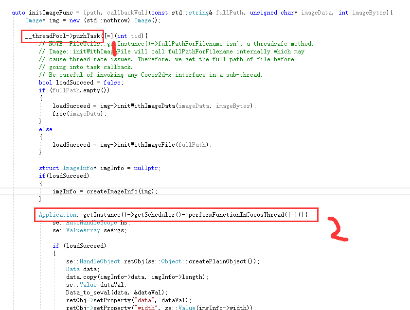 下图中的代码1部分是在线程池中添加一个读取图片资源的任务,代码2是在cocos线程中将内容传递给js层。