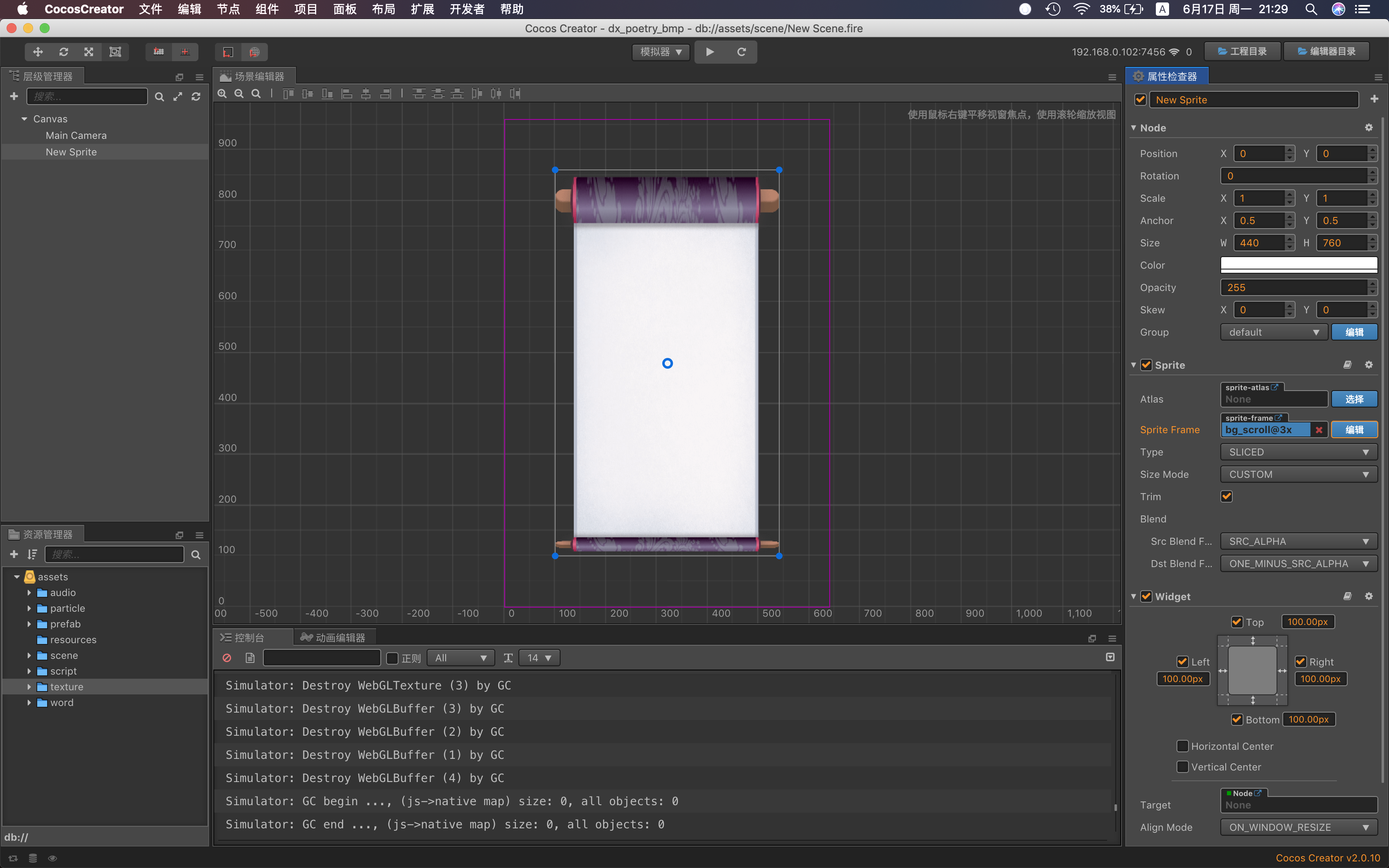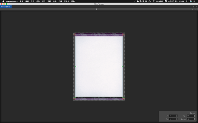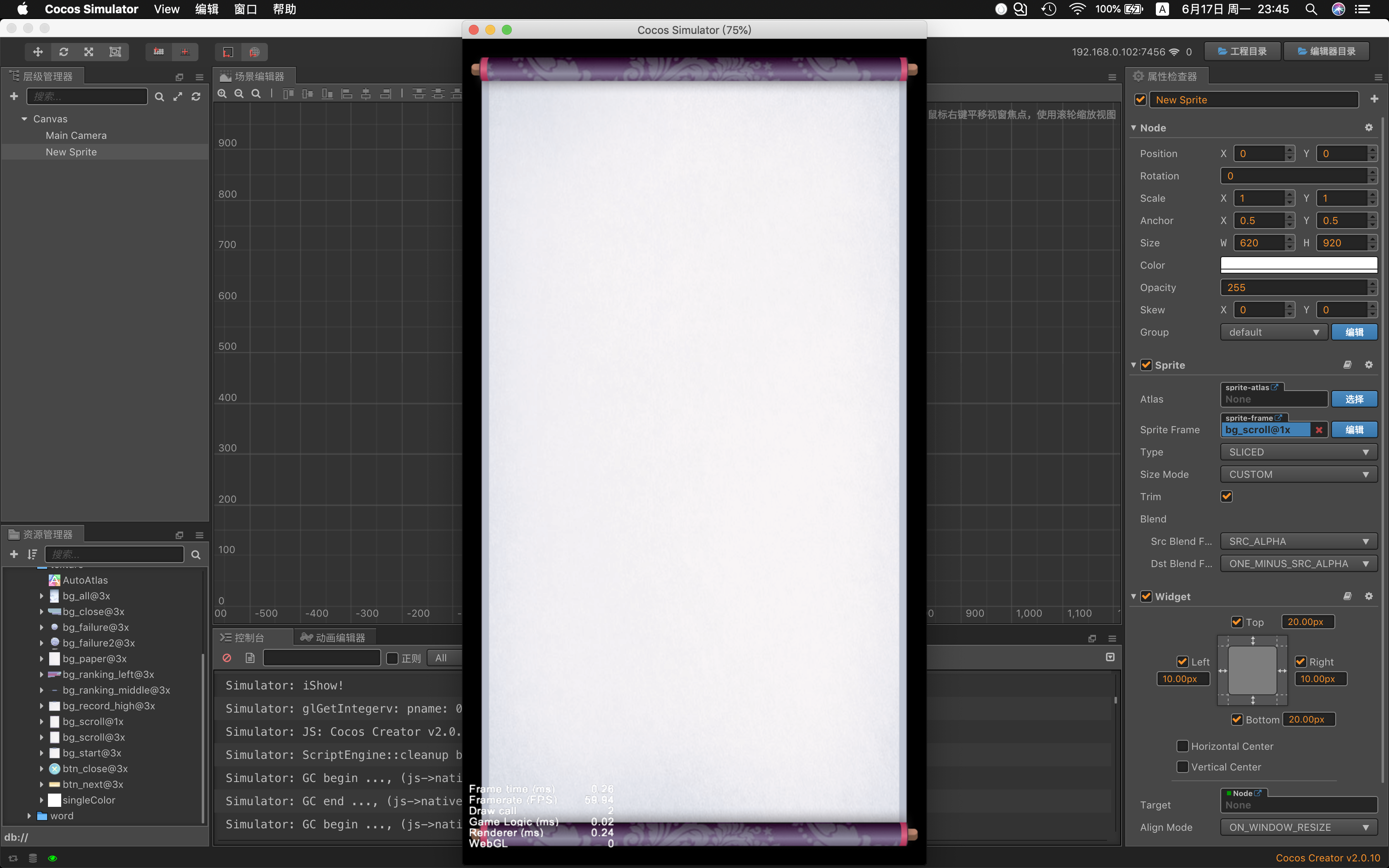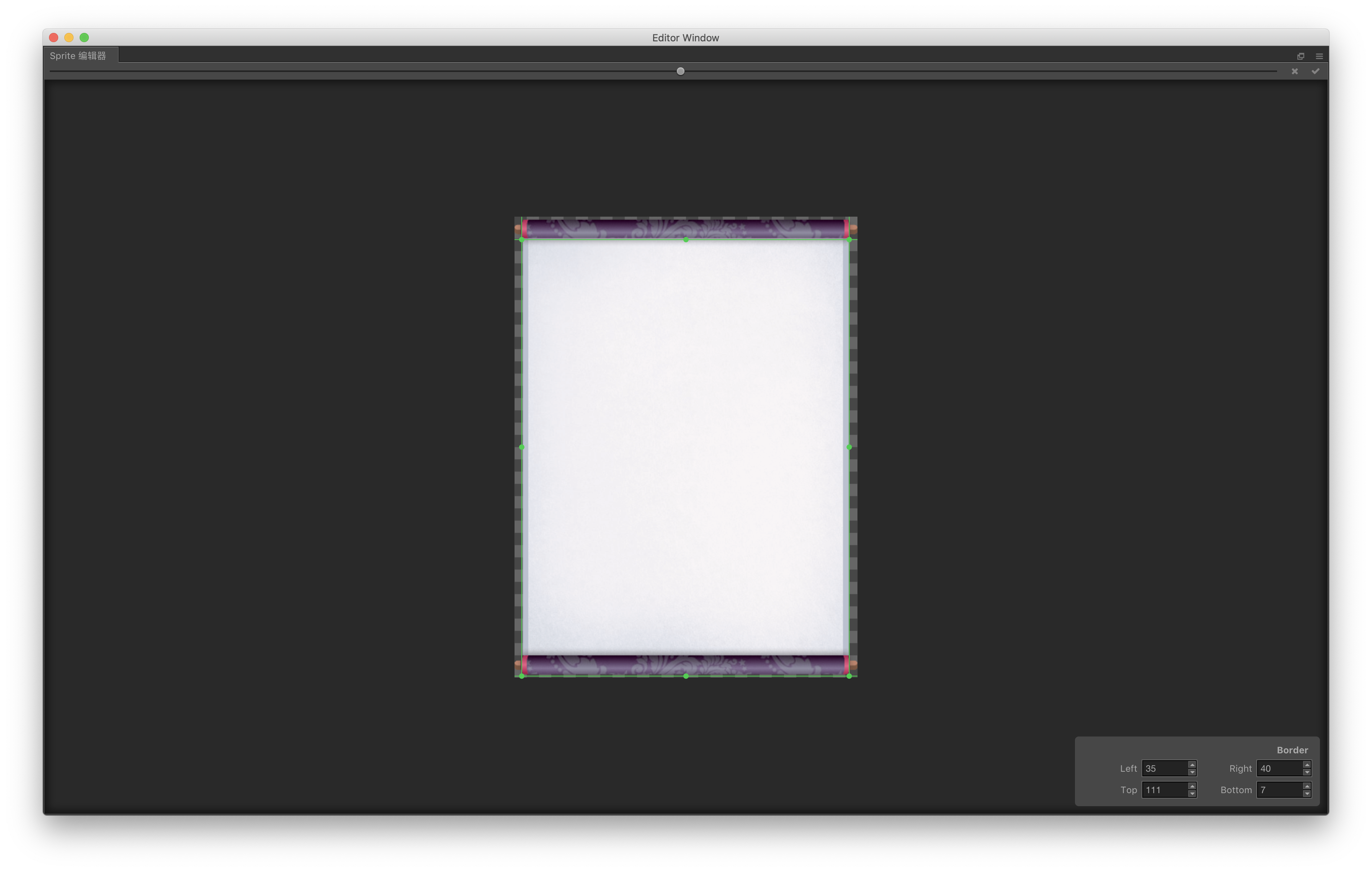 你应该是不太理解吧,用widget干啥,设置好九宫格控制宽高就可以实现卷轴慢慢展开,sprite编辑器区域搞这么大干啥,这个区域是伸缩选取的部分,取中间一小块不就行了。