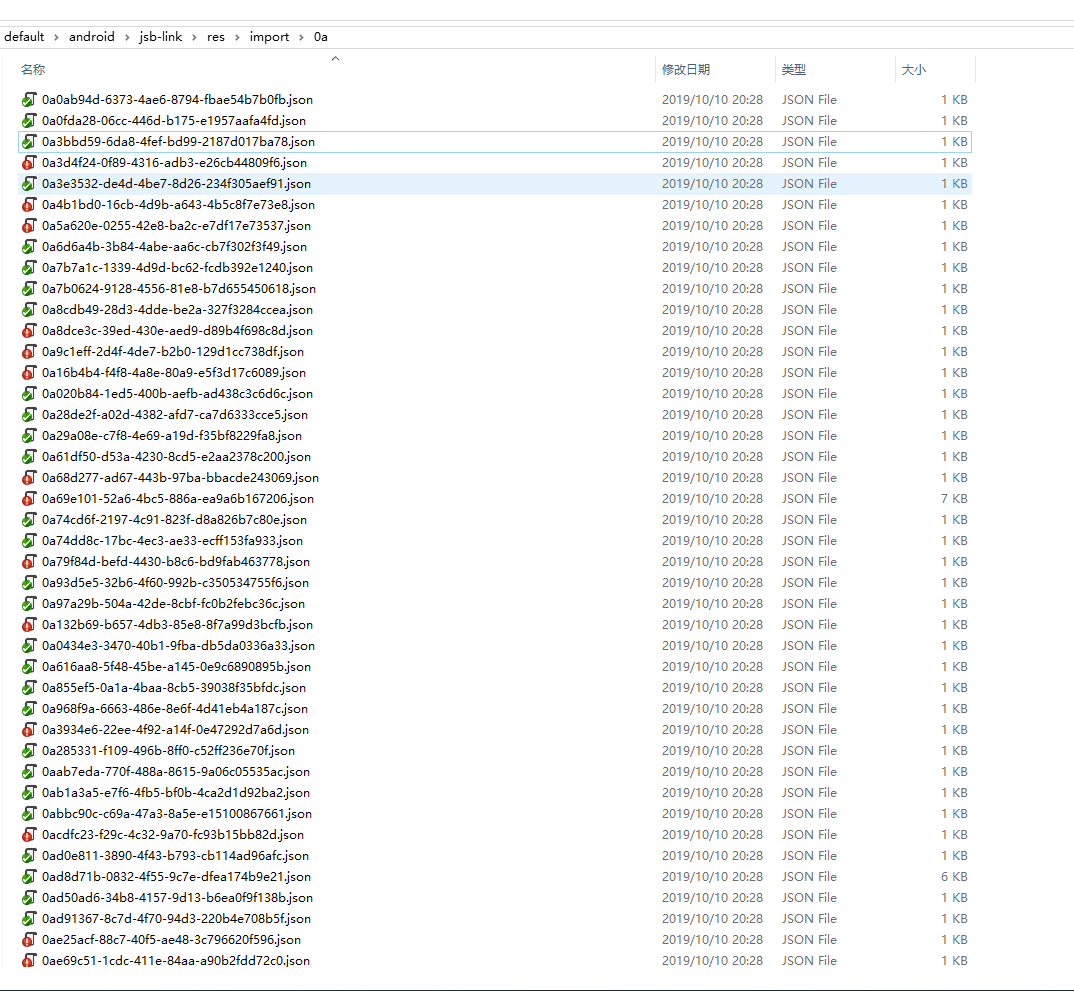 现在发布的res/import/…目录下的xxxx.json文件太多,主要是resource目录下的图片文件比较多,每个文件也就是一个spriteFrame的.meta文件信息的标记,内容很少,但是却占用一个.json文件。下载也占用一次连接,能否将这些文件进行合并,不说合并多,只要将import/00/xxxxxx.json下的所有文件合并到一个00.json文件也好,这样最多也就是目录数量的文件个数,而不像现在,每个目录都是几十几百个小的.json文件,我的工程可能比较大,这种碎文件太多,看看这一个00目录下的文件就 有50多个: